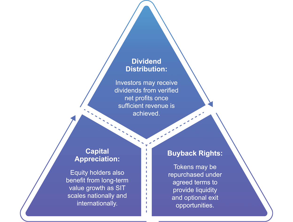 Token holders participate in the long-term success of the SIT platform through their equity interest in the SIT Special Purpose Vehicle (SPV), which owns the core intellectual property and licensing rights.